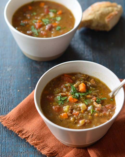 Use an immersion blender to puree the soup until the broth is slightly thickened, or to desired consistency. (Be careful not to puree too much or the soup will get too thick, and you’ll lose the integrity of the lentils.) If you don’t have an immersion blender, transfer about 2 cups of the soup to a blender and puree until smooth, then return the blended soup to the pot. Garnish with fresh chopped parsley if desired and serve.